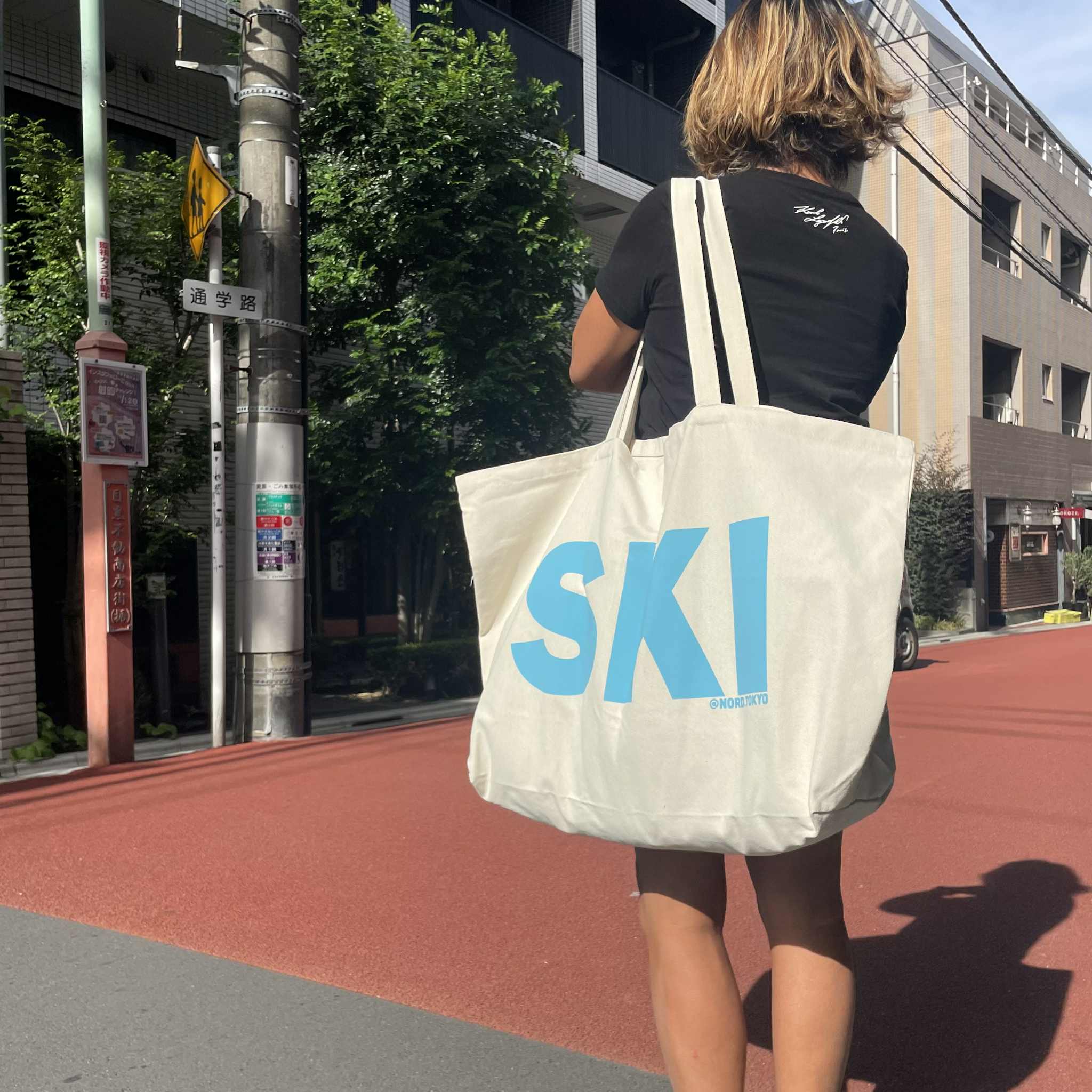 大きなバッグに大きなSKIロゴがきいてる、しっかりした生地のトートバッグです。